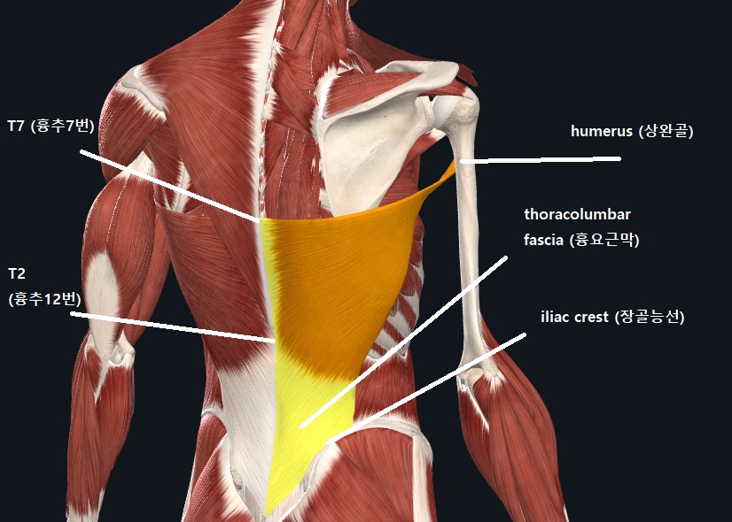 기시 : 흉추 7번~12번 (spinous processes 7~12), 흉요근막 (thoracolumbar fascia) , 장골능선 (iliac crest)