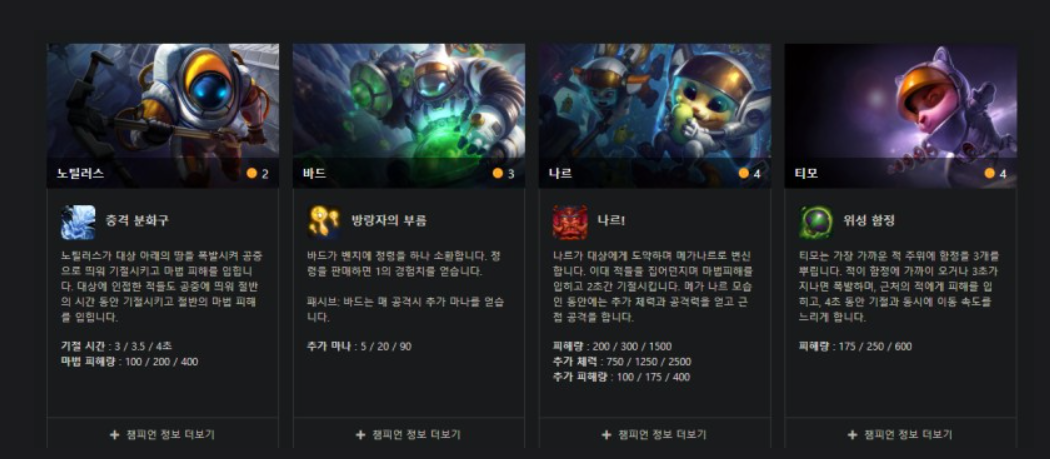 우주비행사의 시너지 같은 경우에는 마나 소모량이 30 감소합니다. 이는 시너지를 맞췄을 때 궁극 기를 빨리 사용할 수 있다는 것을 의미하고 후반부로 치달을수록 티모의 말도 안 되는 궁극이 쇼가 펼쳐질 것으로 예상합니다.