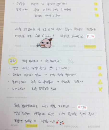 개인적으로는 공부를 하는 학생들에게 좋은 플래너라고 생각합니다. 실제로 스터디 플래너가 따로 나올 만큼 그 인기가 사용자들 사이에서도 좋은데 과목별로 목표를 세분화 해서 적는 공간도 마련되어 있고 스스로에게 주는 피드백을 적을 수 있는 공간도 있어서 여러가지 업무나 계획으로 인해서 머리가 복잡한 사람들에게 유용하게 만들어진것 같아요.