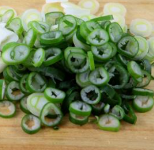 3. 적당히 볶아준 다음 잘게 쎃어놓은 대파를 넣어 줍니다. 이 때 대파의 크기는 조각 낸 스팸의 크기와 비슷하게 해주시는 게 좋아요. 이렇게 스팸과 대파가 기름과 볶아지면서 대파의 향도 기름에 베이게 되겠죠. 이때 굉장히 맛있는 냄새가 올라 올거에요. 계속 센불로 볶아주세요.