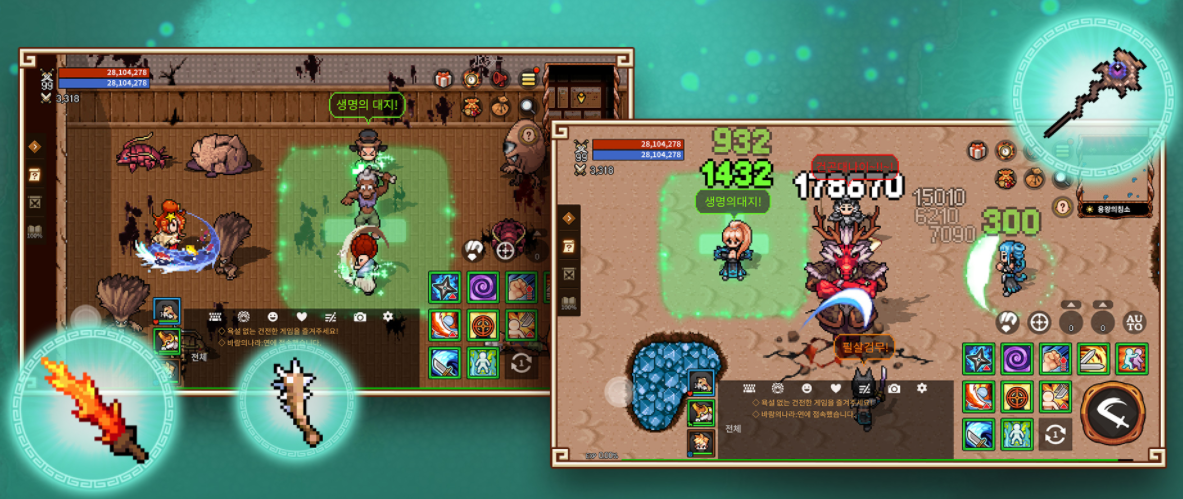 그래픽 디자인을 말하고 싶어요. 전체적인 그래픽이나 게임 디자인이 PC 바람의 향수를 그리워해서 게임을 시작한 사람이 많다 보니 아무래도 최대한 이식을 시켜서 개발하려고 많이 노력한 모습들이 보여요. 물론 모바일 특성에 맞춰서 어느 정도 타협을 한 부분들이 있지만, 마을의 모습이나 업데이트가 진행되는 과정들이 PC 바람의 업데이트 과정과 유사하게 흘러가고 있고 장비의 이름이나 괴물 같은 부분들도 최대한 변화 없이 그대로 출시하고 있습니다.