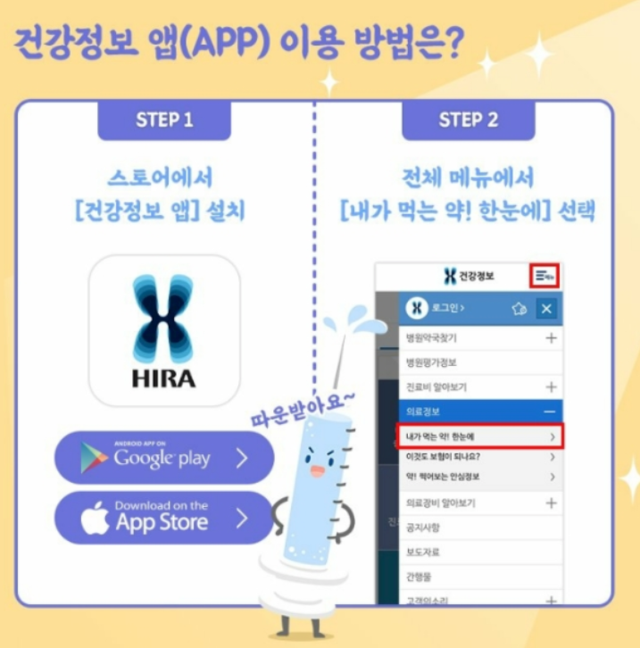 현재 해당 서비스는 컴퓨터뿐만 아니라 휴대폰으로도 얼마든지 확인할 수 있습니다. 구글 플레이스토어 혹은 앱스토어에 접속하셔서 건강정보 앱을 검색하신 이후 다운받으시고 전체 메뉴에서 '내가 먹는약 한눈에 서비스'를 클릭하신 다음 로그인하시면 간편하게 해당 정보를 확인하실 수 있습니다.