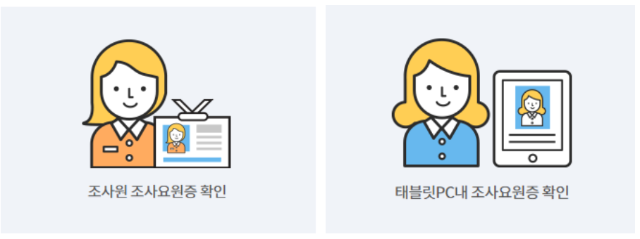 이후에 정상적인 절차는 조사원은 조사요원증을 항상 패용하고 있으며 태블릿PC로 조사가 진행 됩니다. 시작하시기에 앞서 태블릿 내에 조사요원증을 꼭 확인하시기 바랍니다.