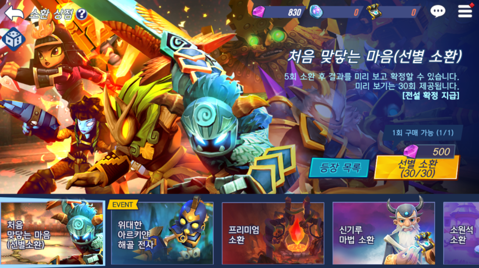 3. 프리미엄 소환이나 해골 전사 뽑기에서 보라색 등급 하나 이상을 뽑아주시면 되고 전설 등급이 나온다면 바로 시작하셔도 무관합니다. 운이 나빠서 아무것도 나오지 않는다면 다시 리세마라를 진행하시면 되겠죠.