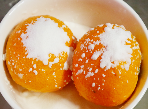 1. 베이킹소다를 귤에 묻혀서 문질러 주세요.