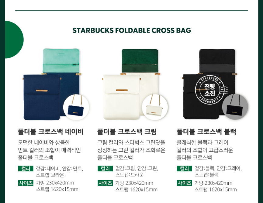 폴더블 크로스백인 만큼 다채롭게 연출이 가능하기에 원하는 방식으로 스타일링을 하기에도 좋더라구요. 과거에 서머레디백으로 큰 인기를 끌었던 스타벅스가 이번에도 스타벅스 폴더블 크로스백으로 많은 관심을 끌게 될지 주목하게 되네요.