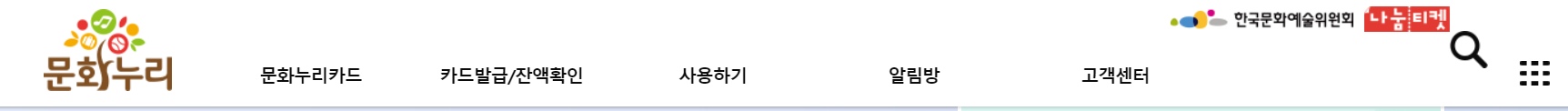 1. 문화누리 홈페이지 상단의 카드발급/잔액 확인 메뉴를 선택