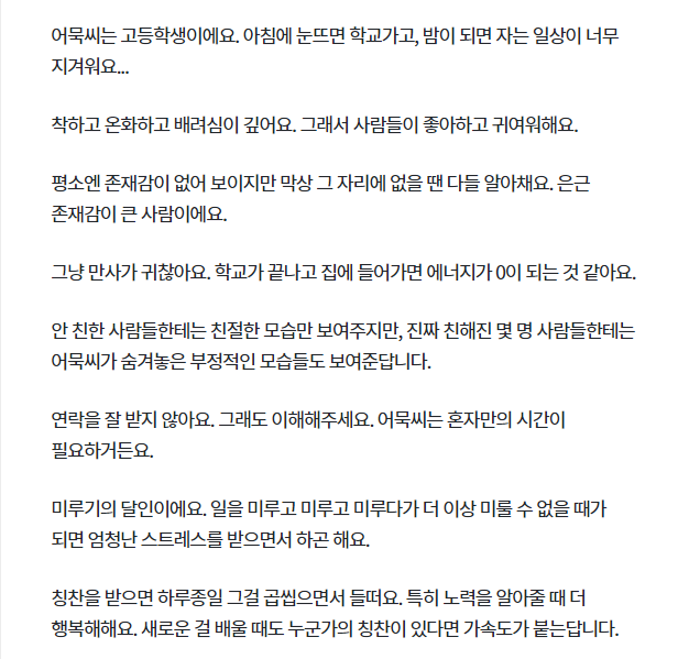 만사가 귀찮아서 연락을 잘 받지 않는 편이고 거리감이 있는 사람들에게는 친절한 편이기만 가까운 사람들에게는 하염없이 편한 모습들을 적나라하게 보여주는 것이 특징이에요. 또한 일을 미루는 것에 통달해 있으며 더이상 미룰 수 없을 때 엄청난 스트레스를 받으면서 마무리를 짓죠.