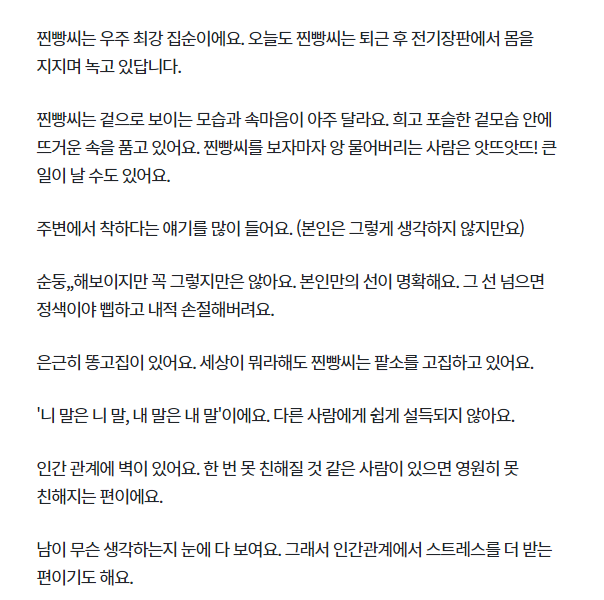 대표적인 집순이로 코로나 시국에 집에서 생활하는게 답답해 하는 사람들이 많고 코로나 블루라고 하는 우울증 까지 오는 사람들도 많지만 찐빵씨는 예외에요. 겉으로 보이는 모습과는 다르게 속은 뜨거운 열정을 품고 있는 경우가 많고 착하다는 말을 많이 듣지만 본인은 그렇게 생각하지 않죠.