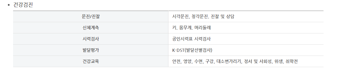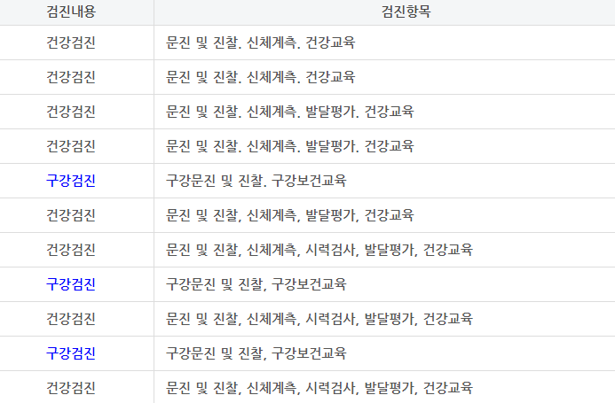 총 8차에 걸쳐서 진행되는 건강검진 세부 검진 항목은 신체계측, 즉 키와 몸무게, 머리둘레 뿐만 아니라 청각이나 시각, 건강교육과 영양, 수면, 안전사고 예방 등 다양한 교육을 수차례에 걸쳐서 진행합니다. 성장에 맞춰서 적절한 교육을로 배치된 커리큘럼이 있으니 아래의 표를 살펴보시면 보다 자세하게 이해하실 수 있습니다.